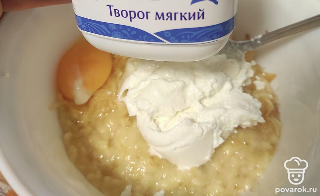 Добавить яйцо и мягкий творог.
