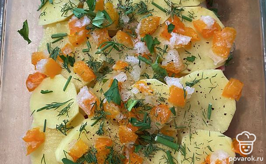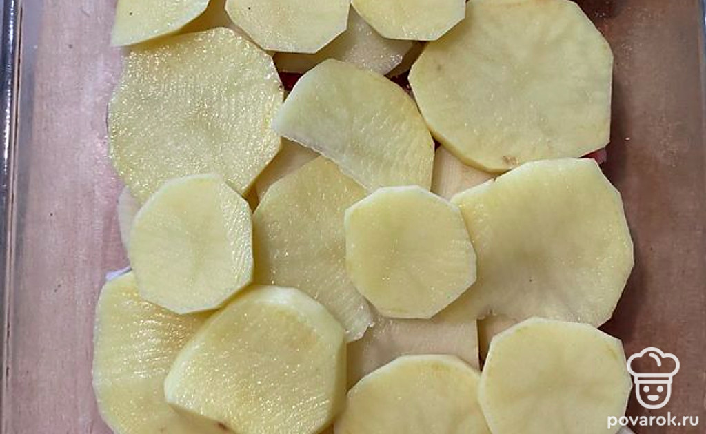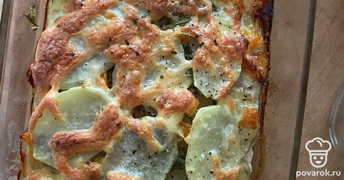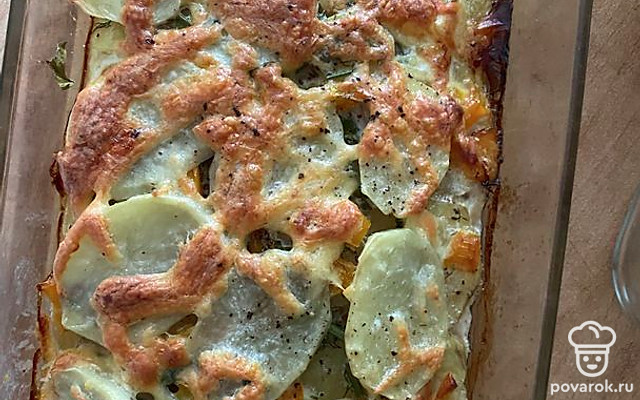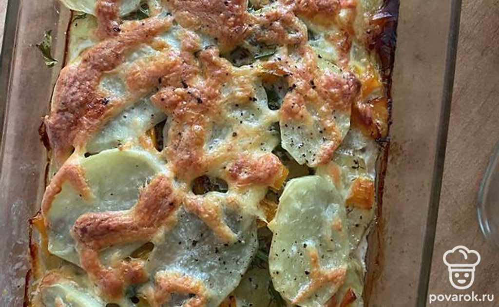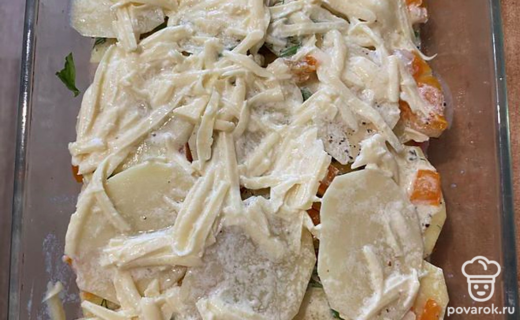 Вылить сверху на запеканку готовую смесь, запекать при температуре 180 градусов 45-50 минут под фольгой.