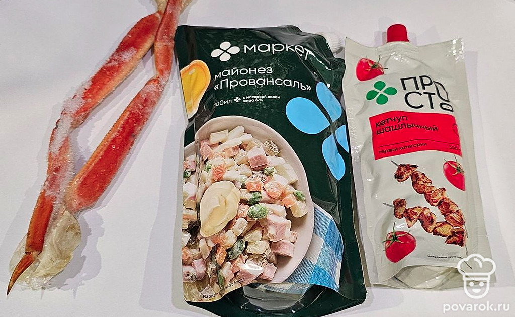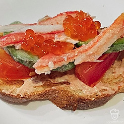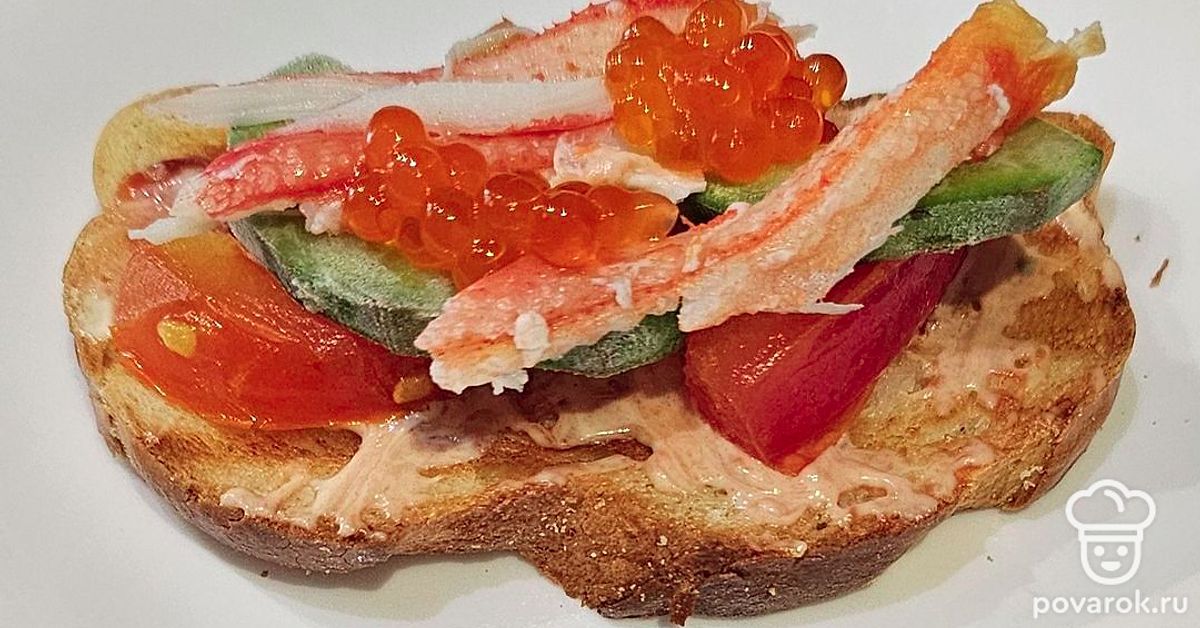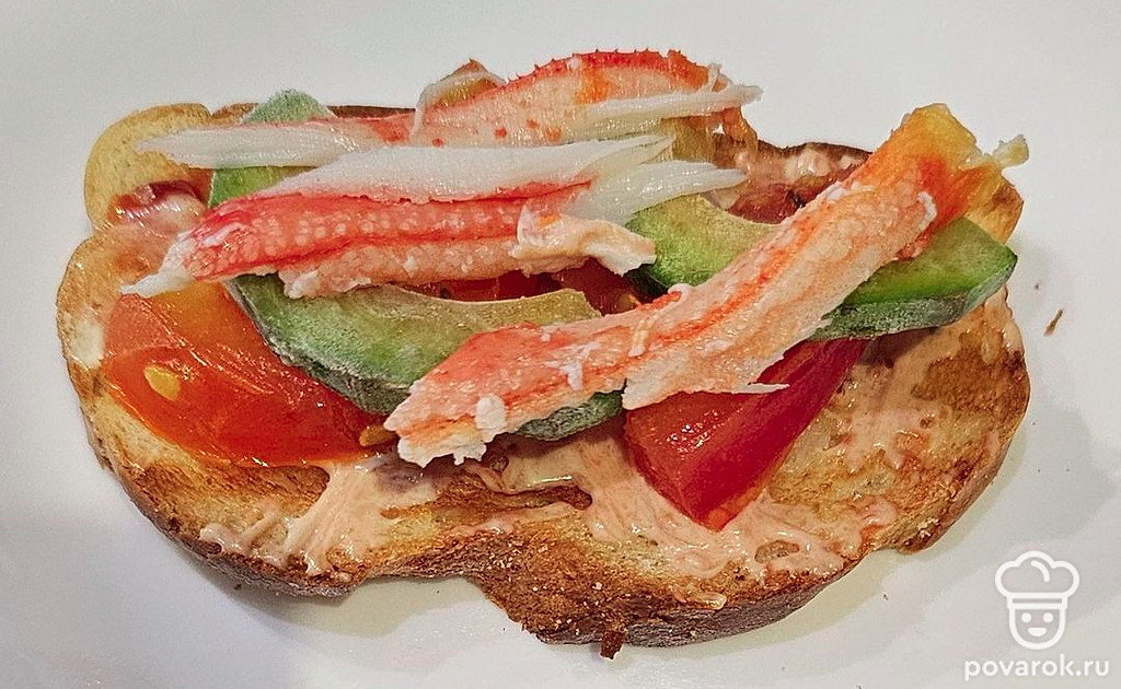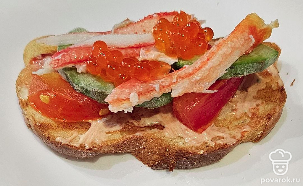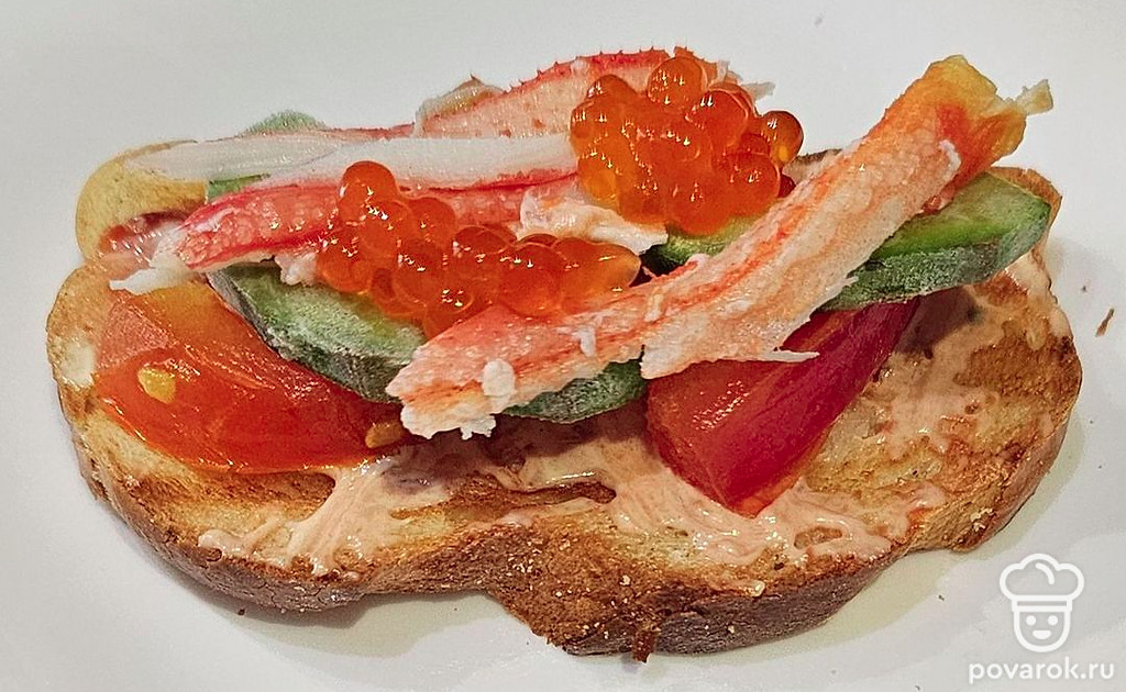 Клешни камчатского краба отварите в воде 3-5 минут, достаньте мясо и выложите на брускетту.