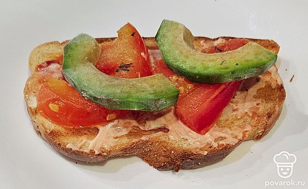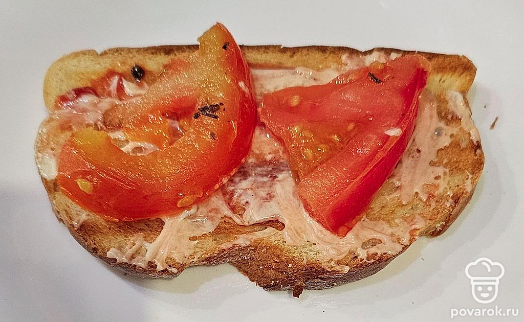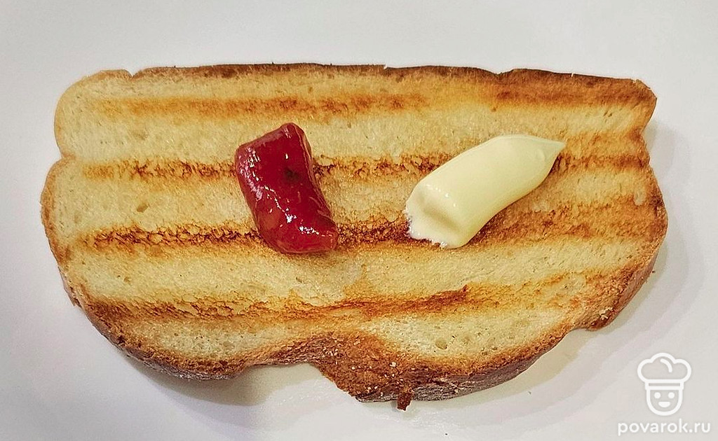 Обжарьте хлеб на сухой сковороде с двух сторон до золотистой корочки. Смажьте майонезом и кетчупом.