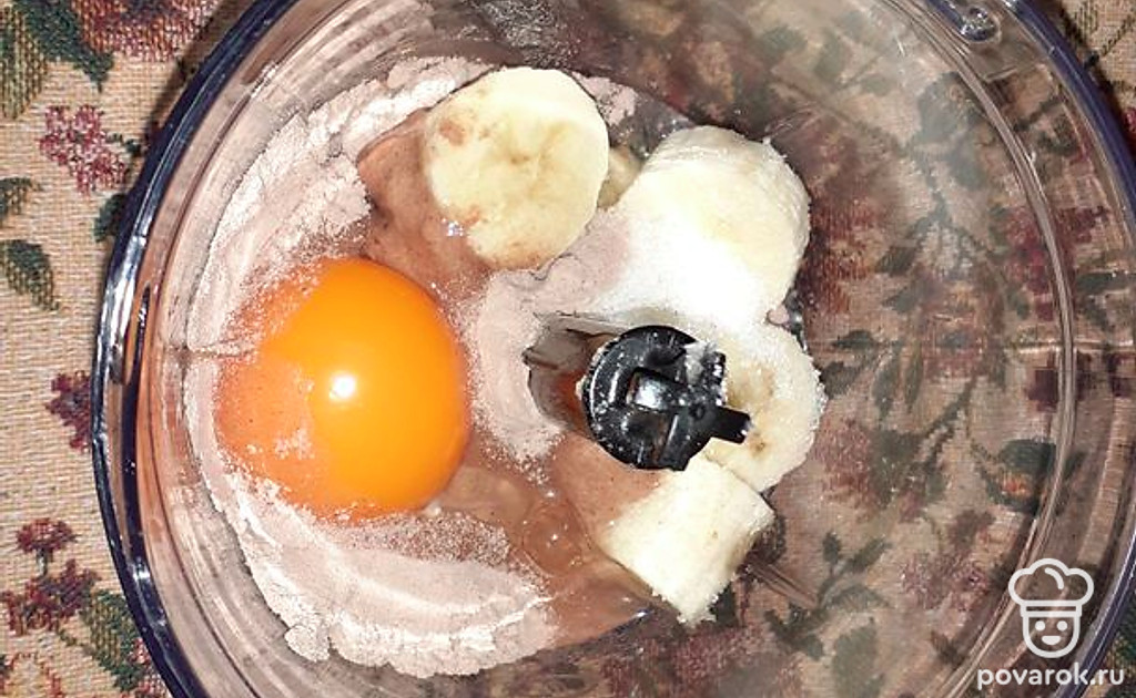 В чашу блендера положить очищенный банан, протеин, сахар и яйцо.