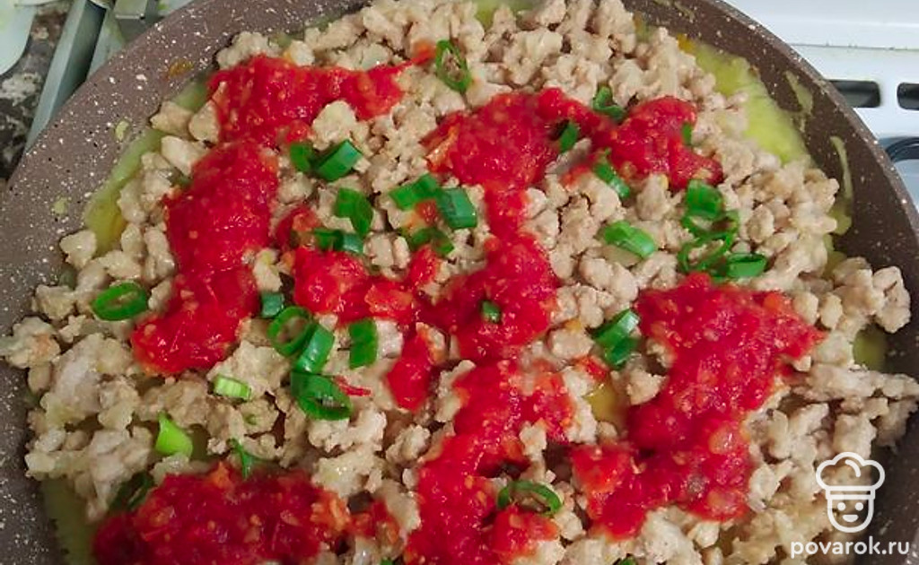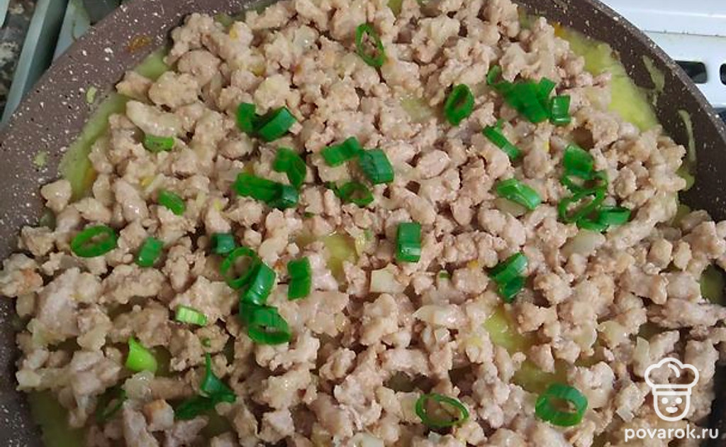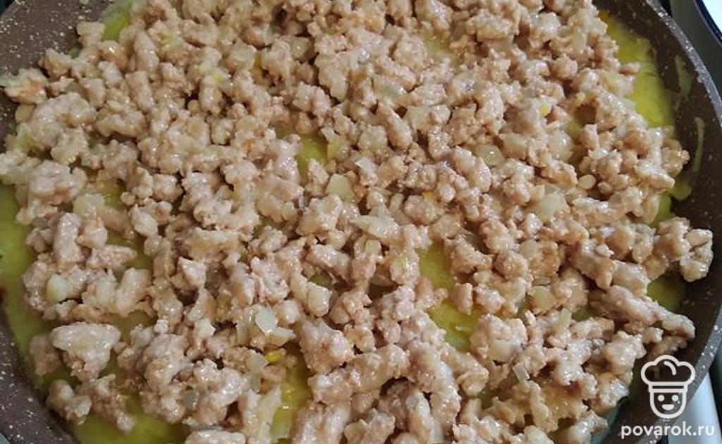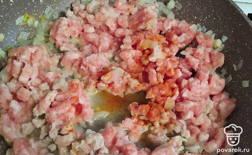 К луку добавить фарш, посолить, поперчить, перемешать, немного обжарить. Закрыть крышкой и тушить 40 минут, по мере надобности добавить воды.