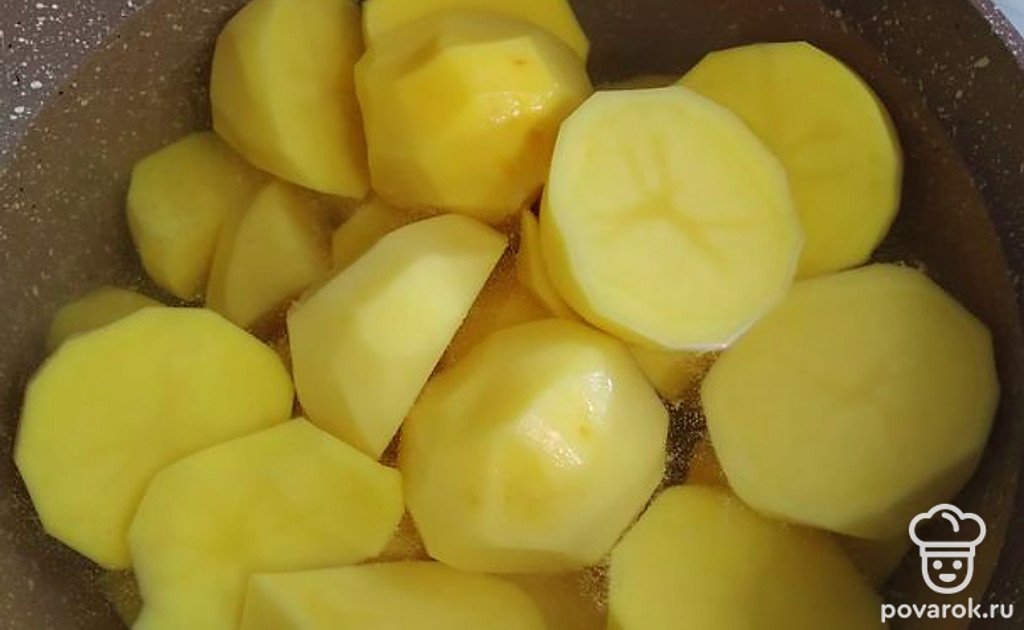 Картошку помыть, почистить, нарезать на 4 части, чтобы быстрее сварилась. Налить воду в кастрюлю и положить картошку, посолить и варить до готовности.
