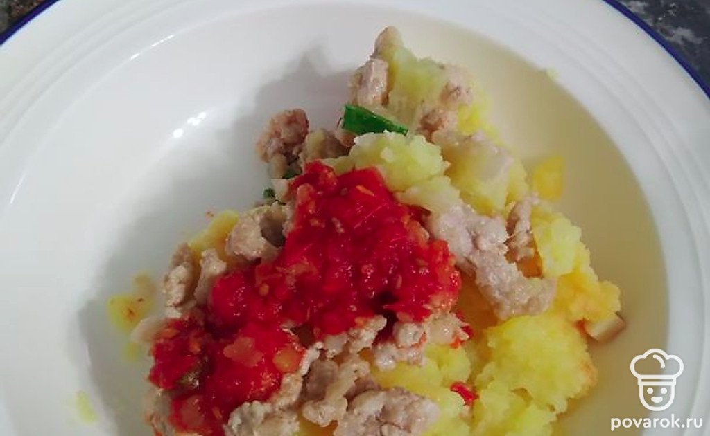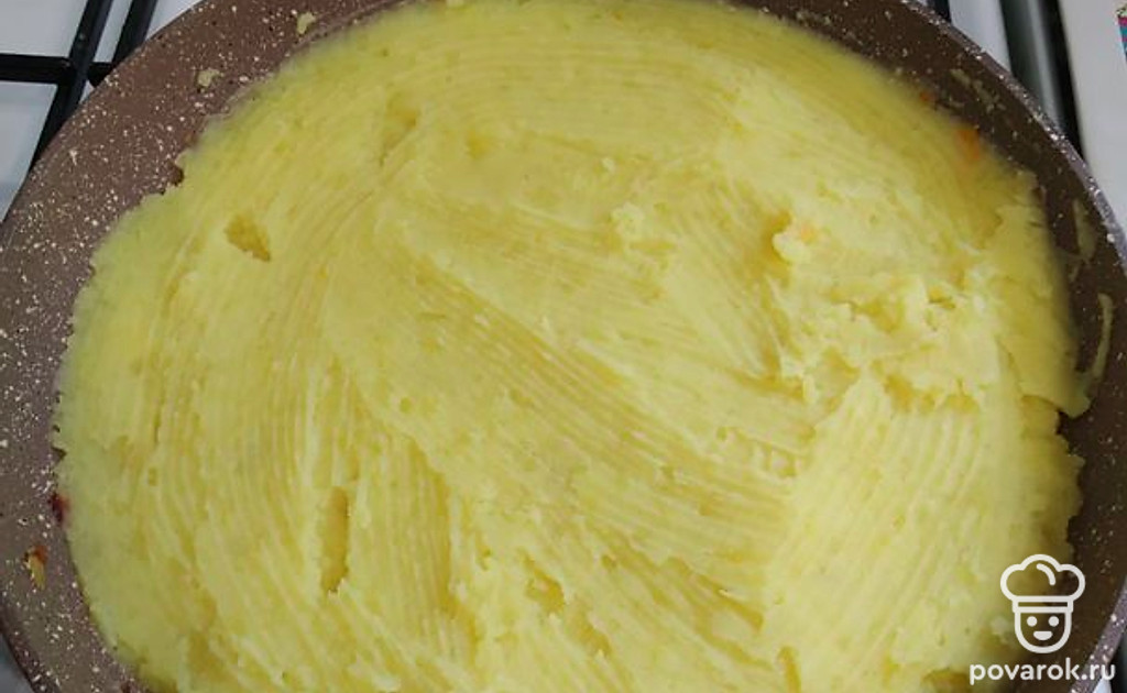 Картошка сварилась, добавляем сливочное масло и мнем толкушкой до состояния пюре.