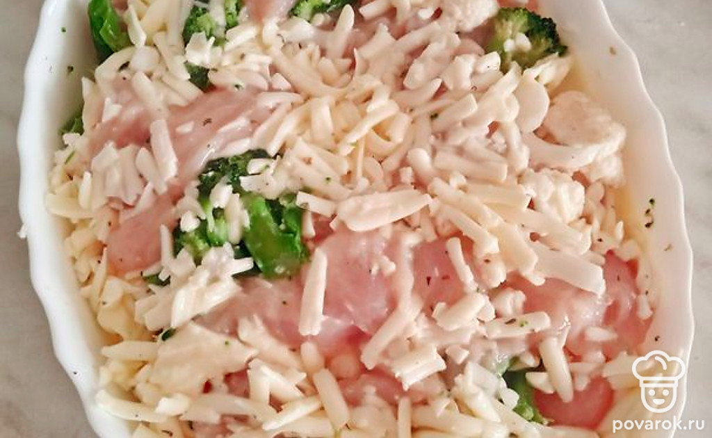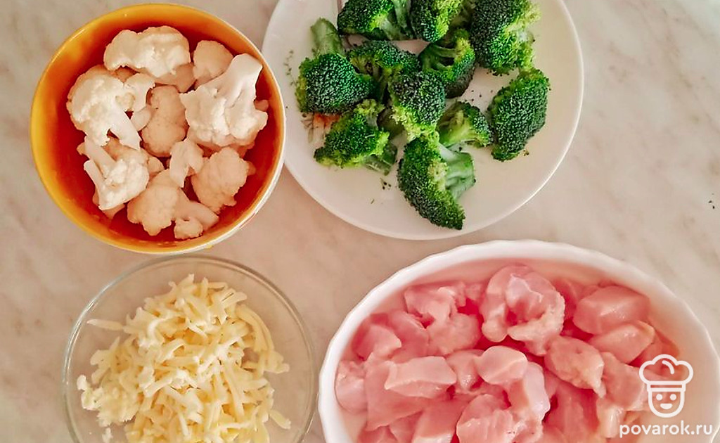 Нарезаем курицу на крупные кусочки, капусту разбираем на соцветия. Сыр необходимо натереть.