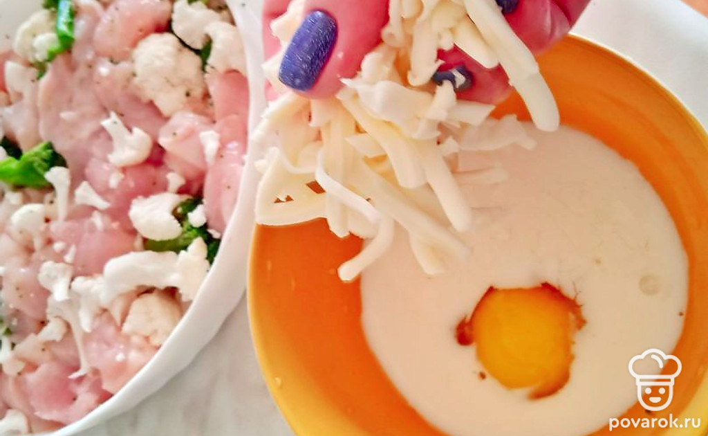Смешиваем курицу с капустой в форме для запекания. В отдельной миске к яйцу добавляем молоко. Можно использовать сливки нежирные. Взбиваем и добавляем тертый сыр и любимые специи.