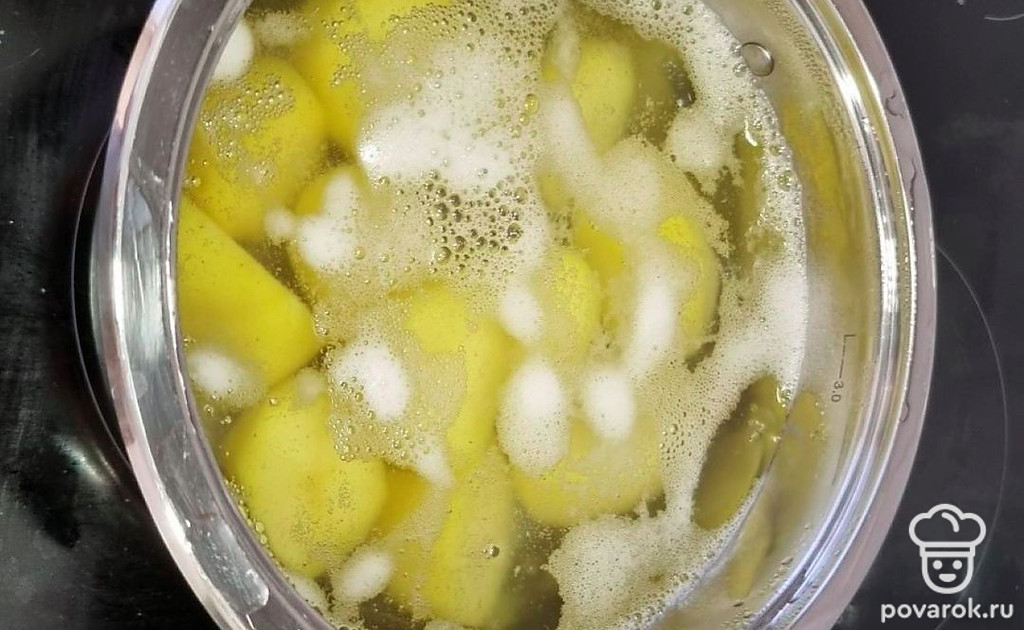 Картофель моем, чистим и ставим варится. За 5 минут до готовности солим по вкусу.