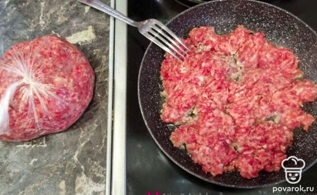 Полученный фарш обжариваем в течении 20 минут до готовности. Через 10 минут от начала жарки добавляем нарезанный лук.