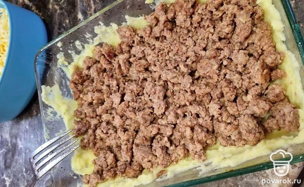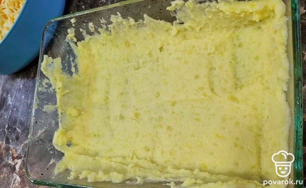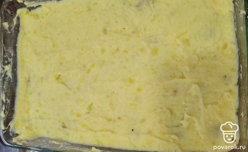 Противень смазываем подсолнечным маслом и выкладываем в него первый слой картофельного пюре.