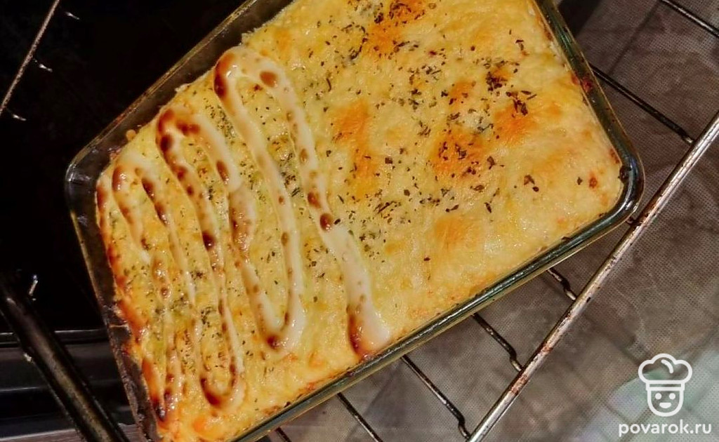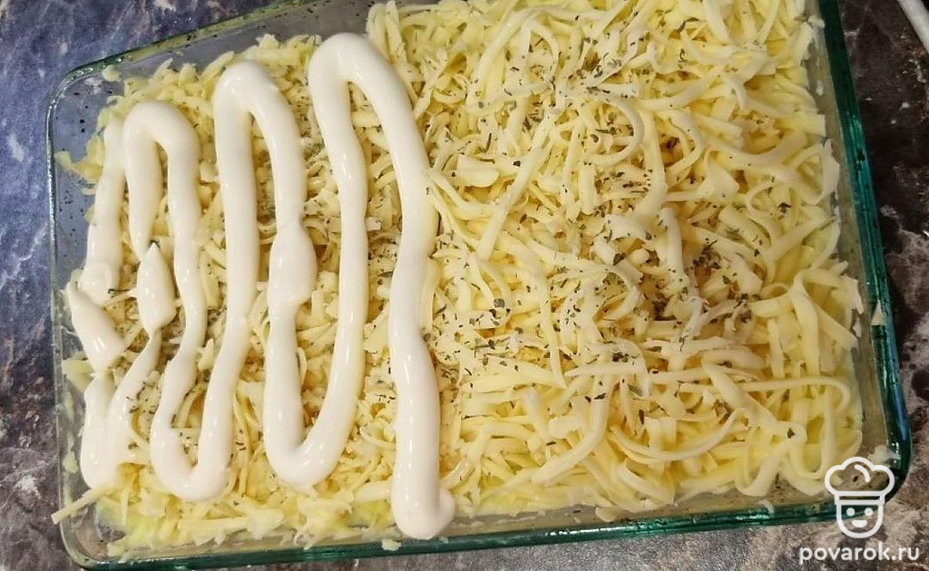Сверху посыпаем тёртым сыром, по желанию можно добавить майонез.