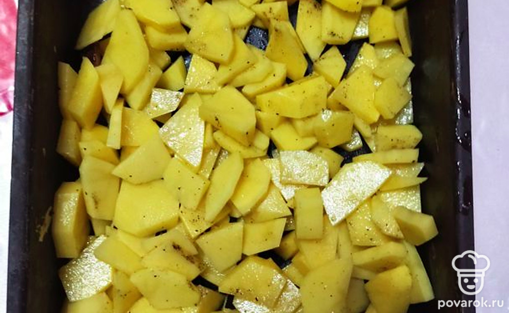 Картофель порезать небольшими ломтиками и уложить в форму для запекания, посолить, поперчить.