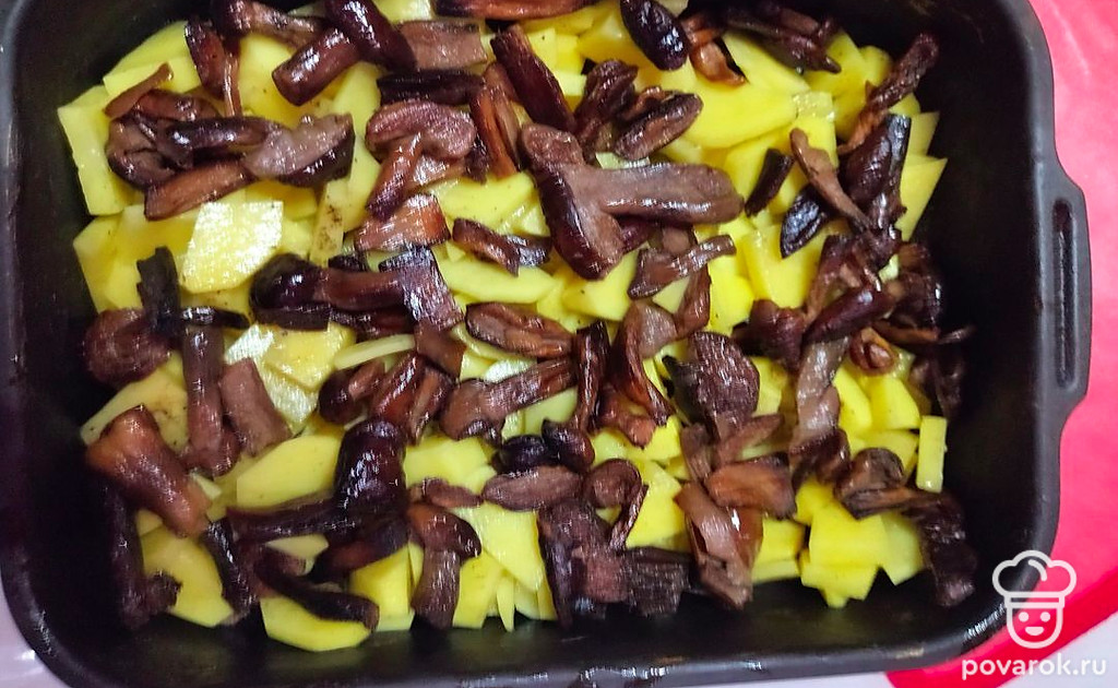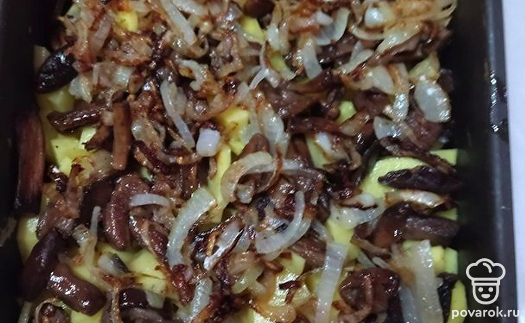 Лук обжарить до золотистого цвета и выложить на грибы.
