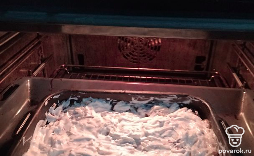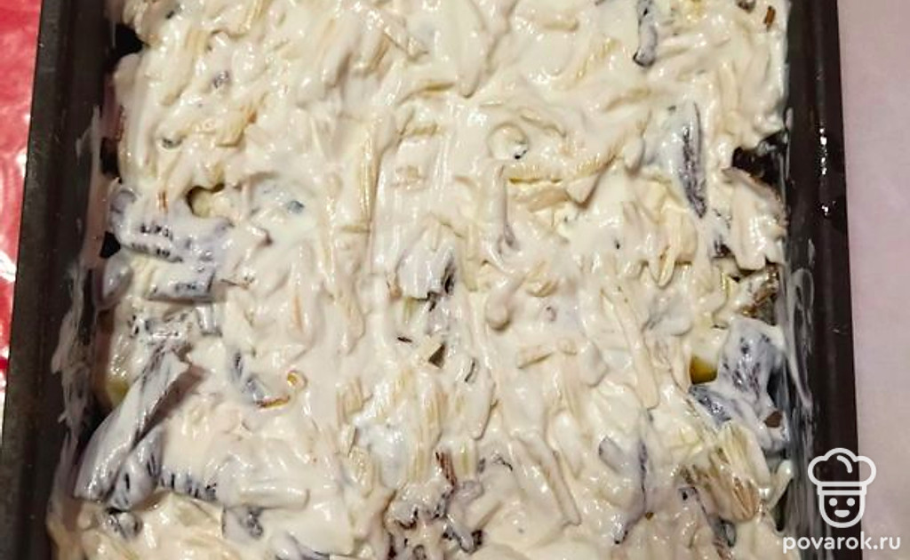 Сметану смешать с половиной натертого сыра и выложить следующим слоем.