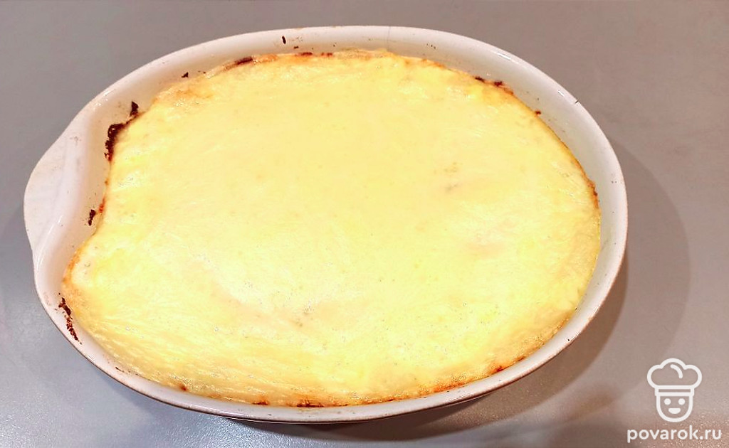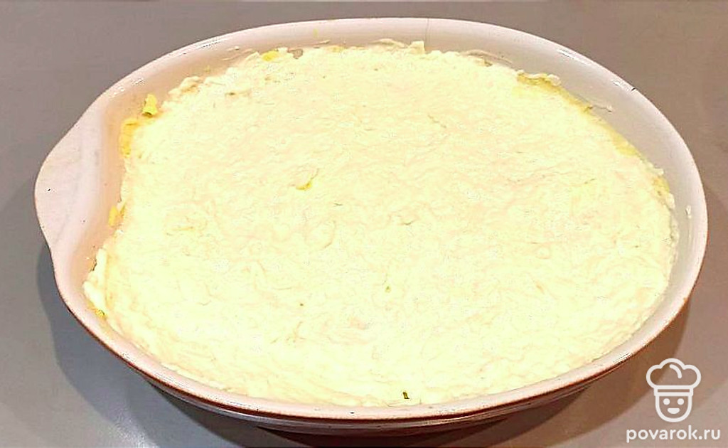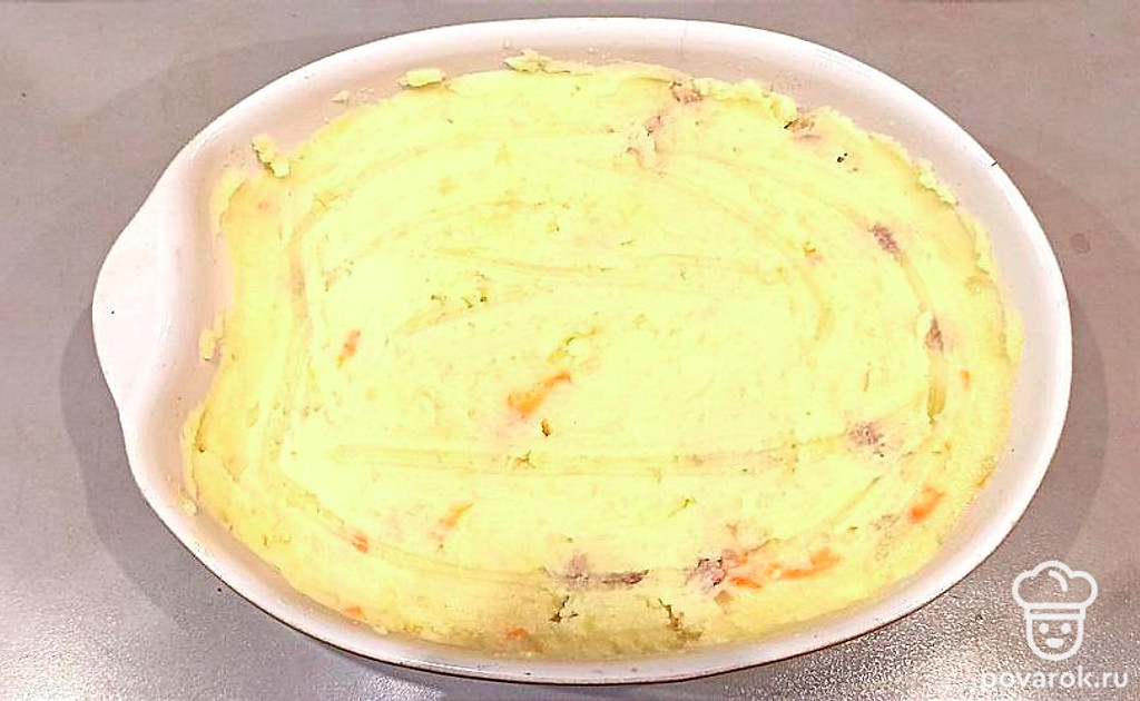 Выложите получившуюся смесь сверху. Поставьте в духовку на 30 минут при 180 градусах до золотистой корочки.