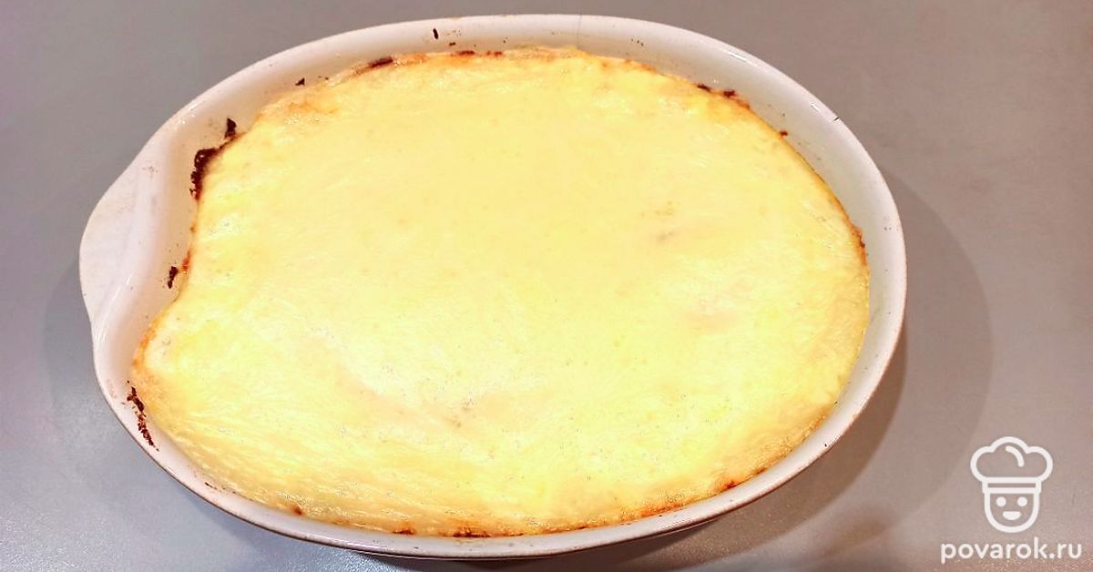 Накладывать запеканку удобно при помощи лопатки, чтобы были видны слои.