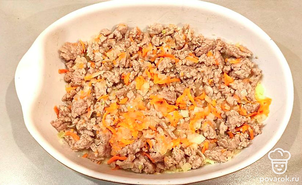 Добавьте мелконарезанный лук и тёртую морковь. Обжарьте до готовности.