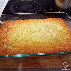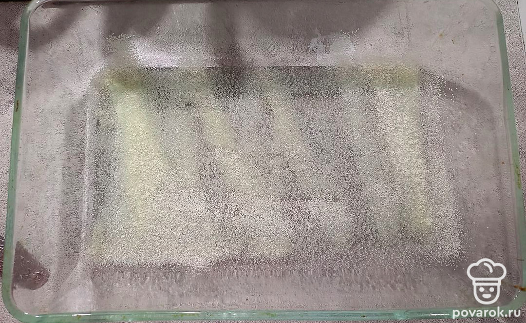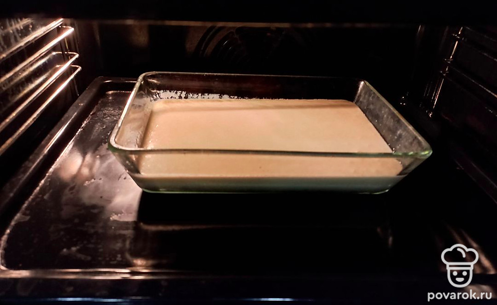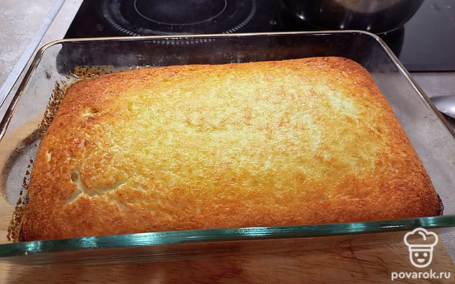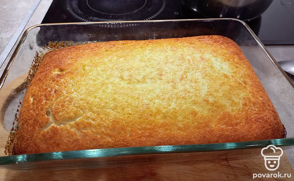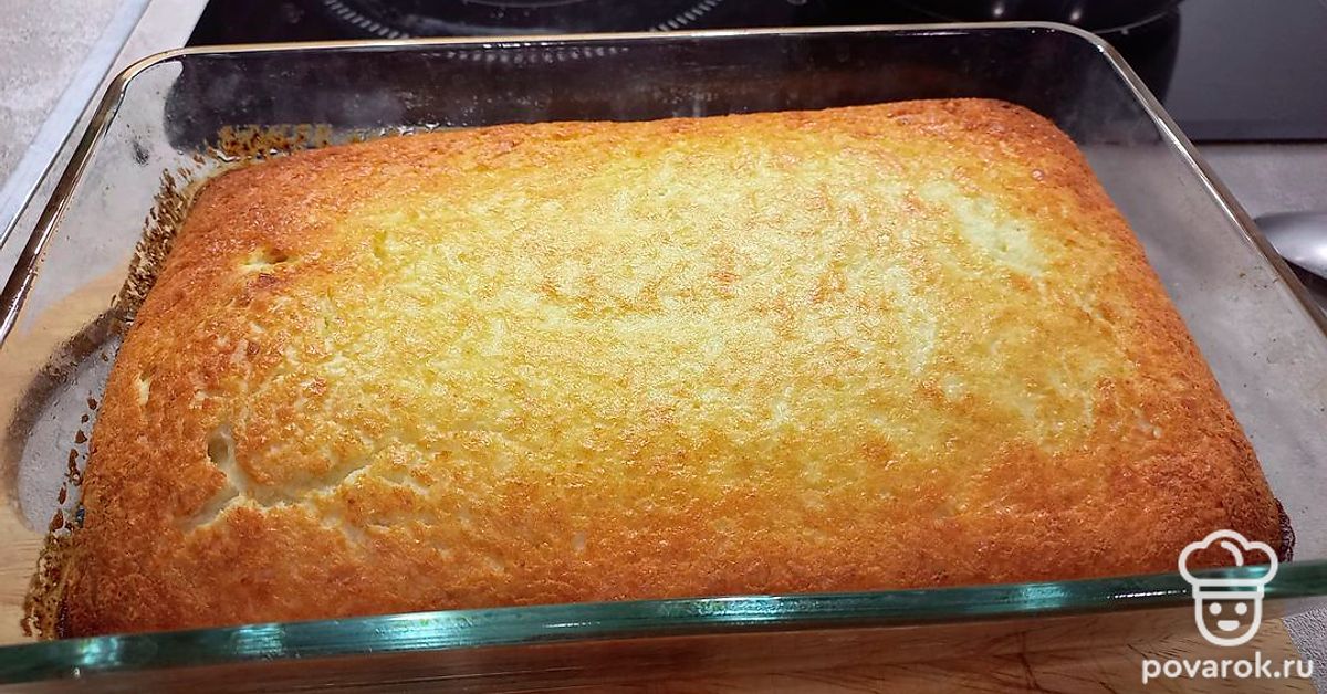 В готовую смесь всыпать манку. Форму для выпекания смазать растительным маслом и посыпать манкой.