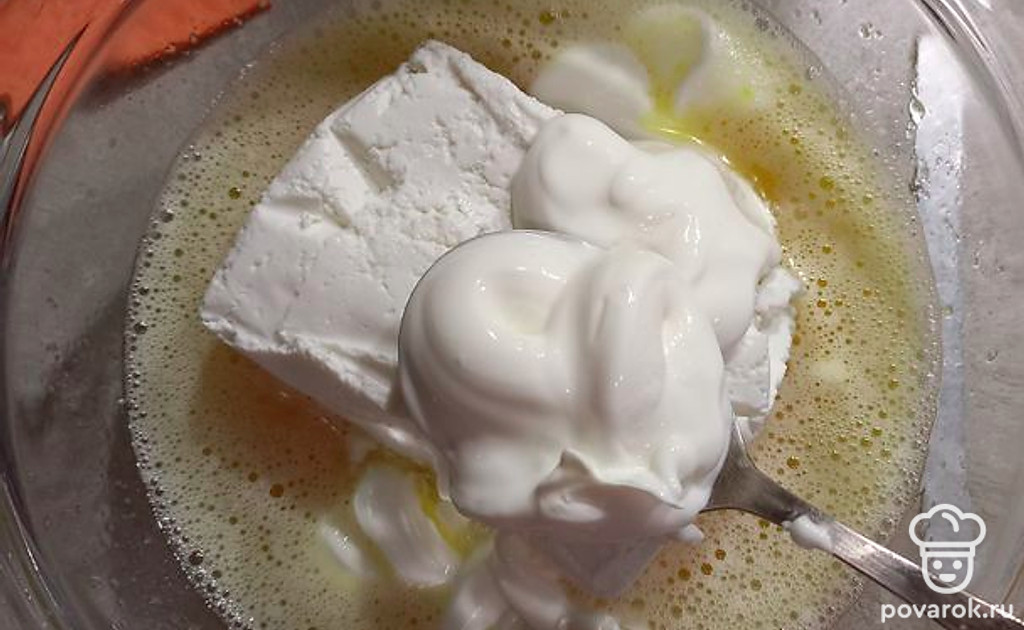 Добавить две пачки творога, 100 грамм сметаны. Все размешать.