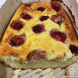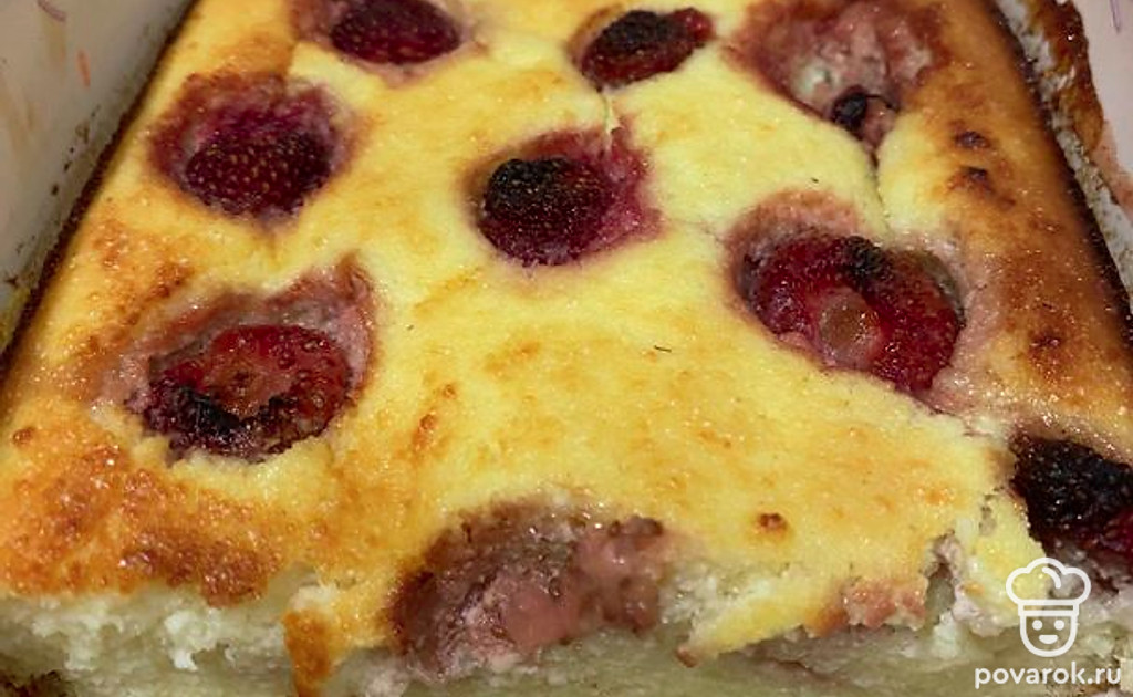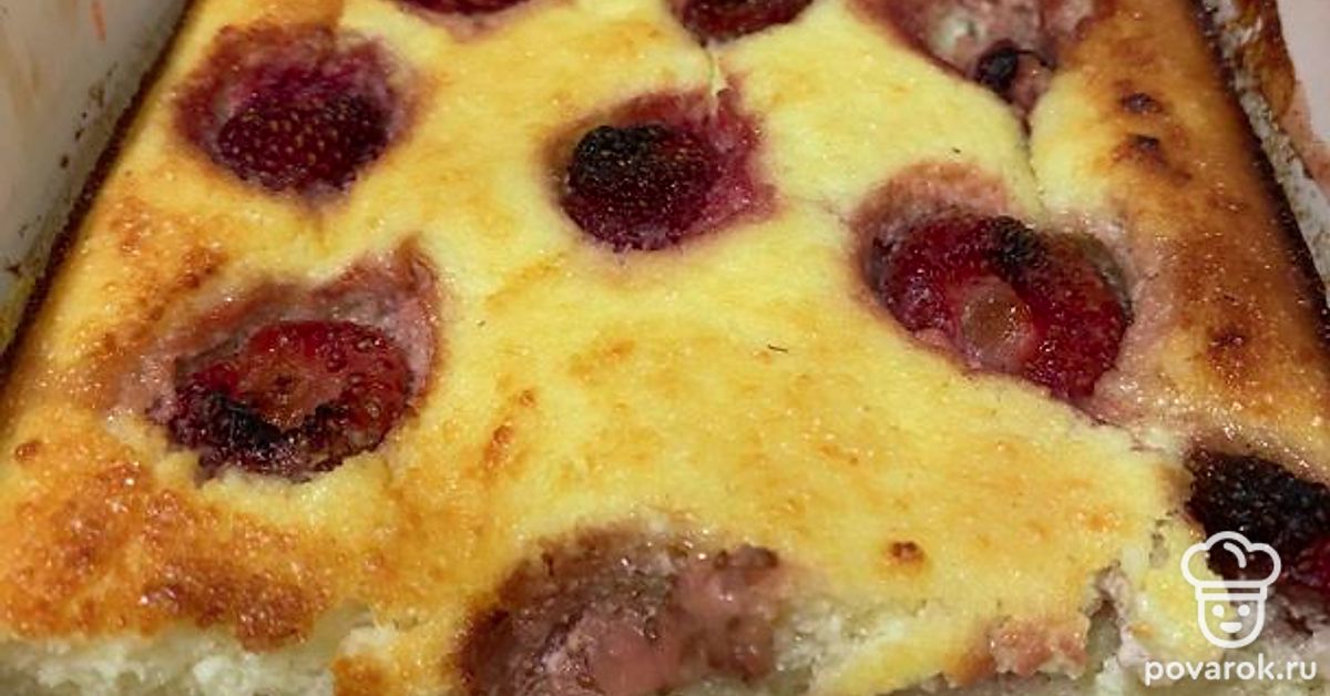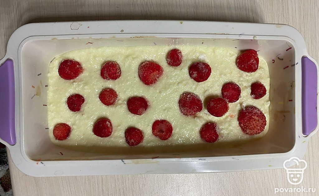 Вылейте тесто в форму для выпечки и выложите ягоды сверху. Отправьте запекаться при 180 градусах 30 минут.