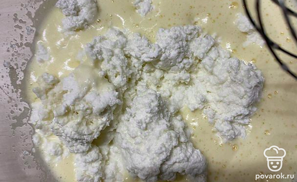 Добавьте творог и размельчите и манку, смешайте блендером.