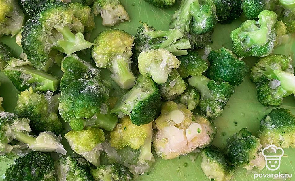 Делим на более мелкие соцветия замороженные броколли. Отрезаем большие стебли.