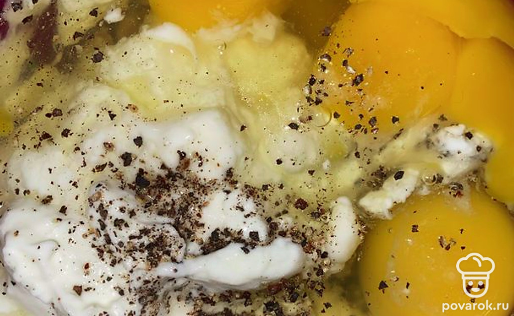 Делаем соус. Смешиваем яйца, йогурт, масло, добавляем соль и перец.