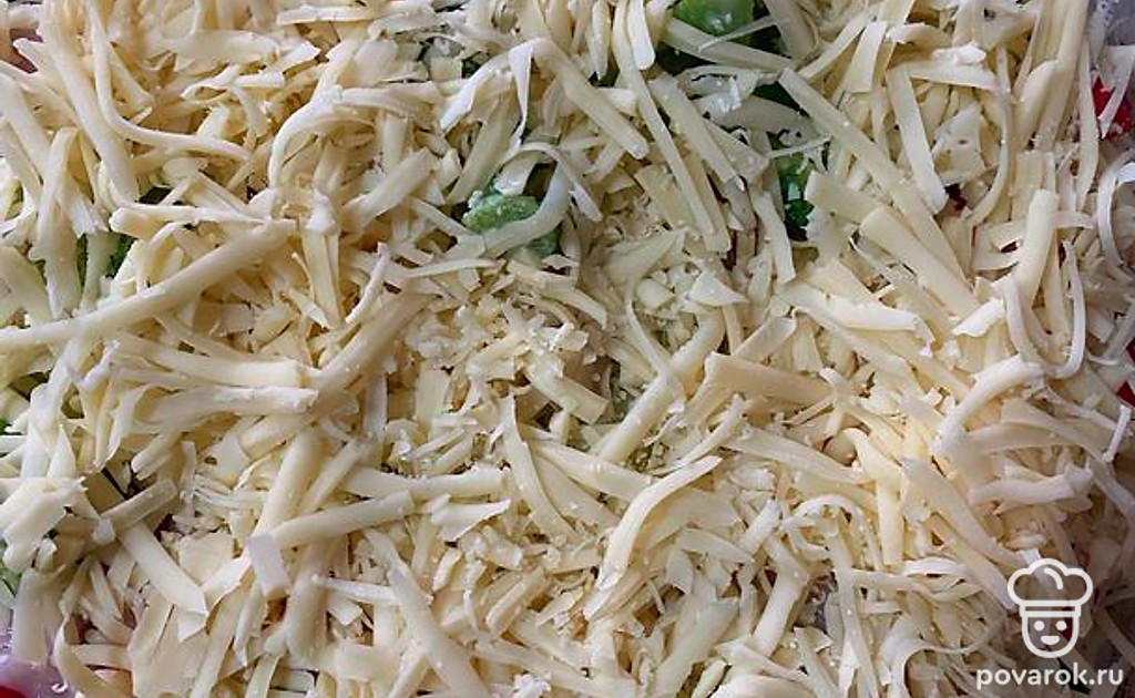 Натираем сыр, посыпаем сверху и ставим в духовку при 180 градусах на 25-30 минут.