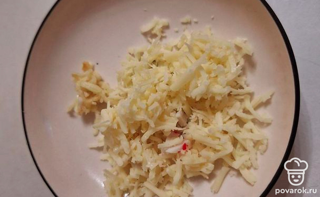 Сыр натрите на мелкой терке. Чеснок почистите и пропустите через пресс.
