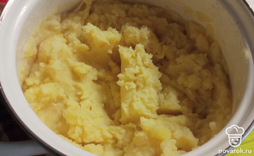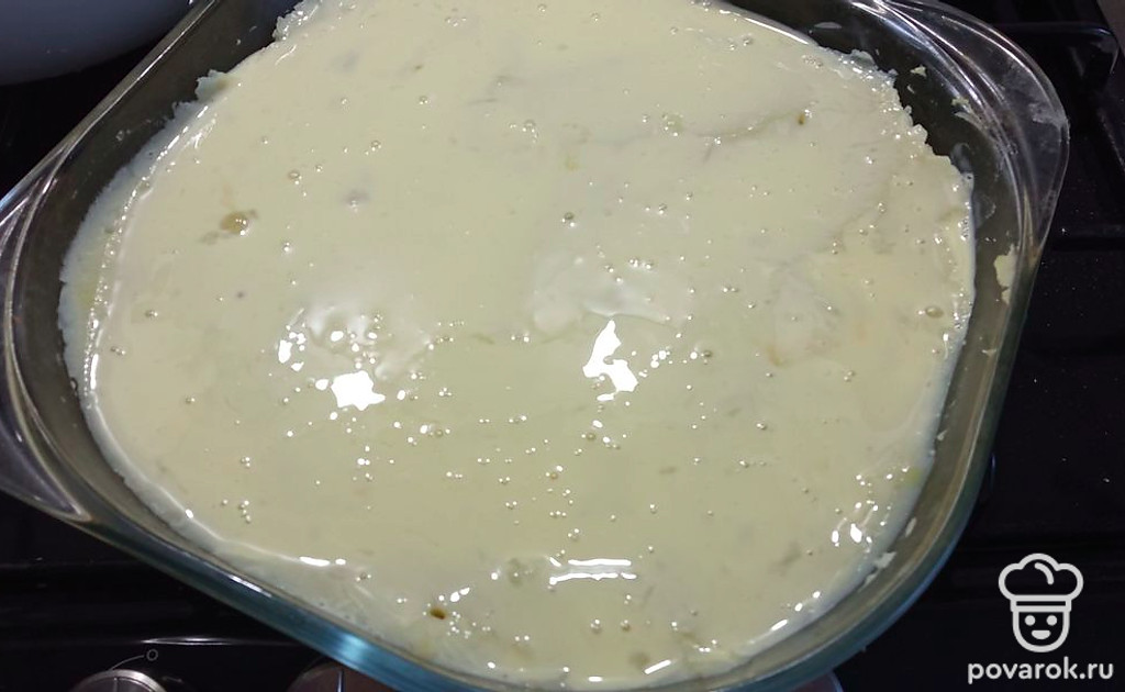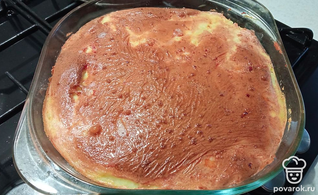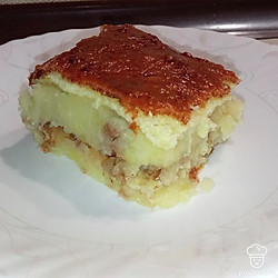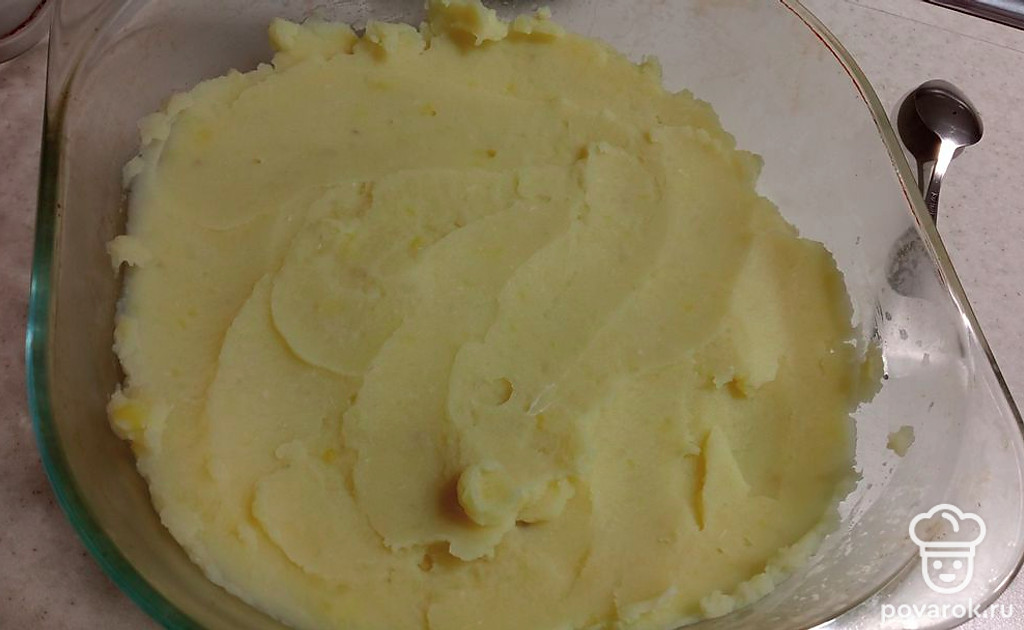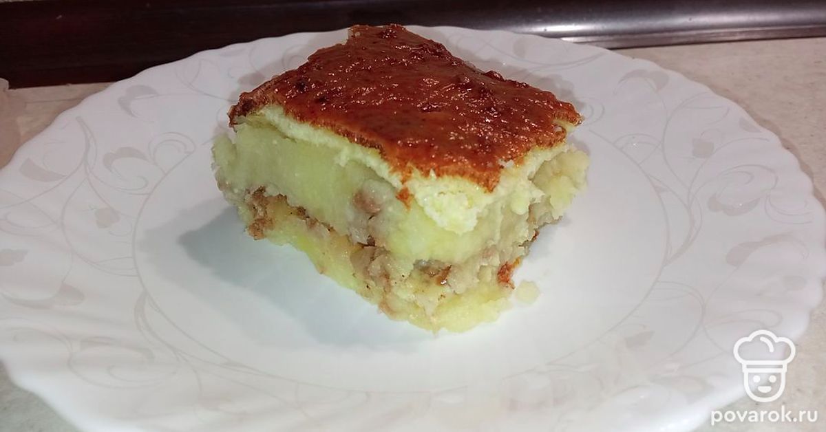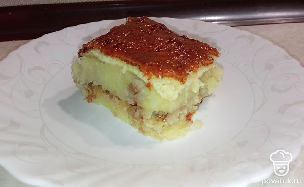 Выложите пюре на фарш и сверху залейте взбитыми яйцами. Выпекайте при 180 градусов 25 минут.