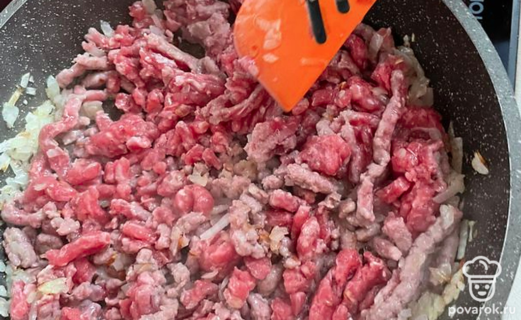 На масле обжариваем мелко нарезранный лук, добавляем туда фарш, специи.
