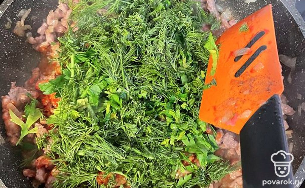 Когда фарш обжарится, добавляем томатную пасту и зелень, перемешиваем и выключаем через 5 минут.