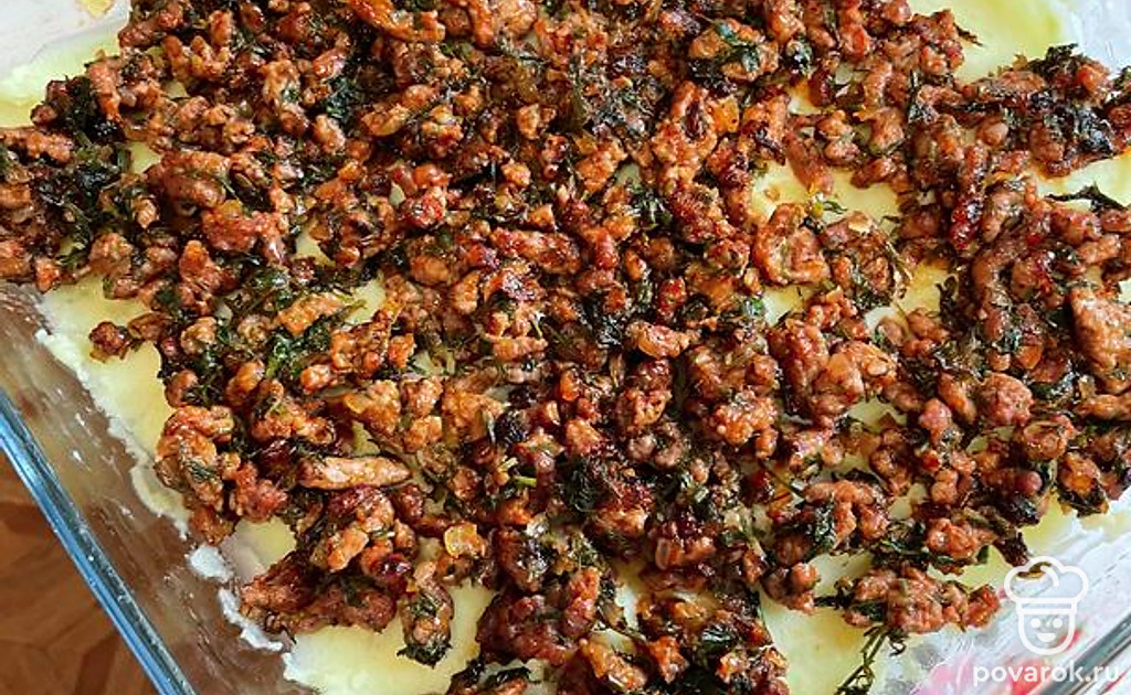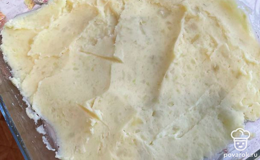Достаем форму, смазываем ее и равномерно выкладываем пюре.