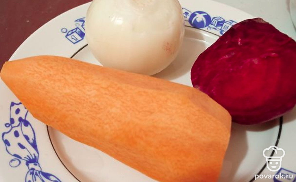 Первым делом необходимо почистить морковь, свеклу, лук.
