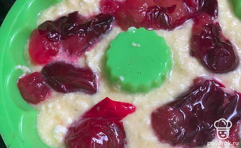 Помыть вишню, убрать косточки и выложить на кекс. Выпекать 25 минут при температуре 170 градусов.