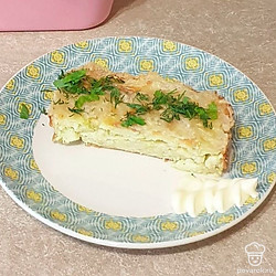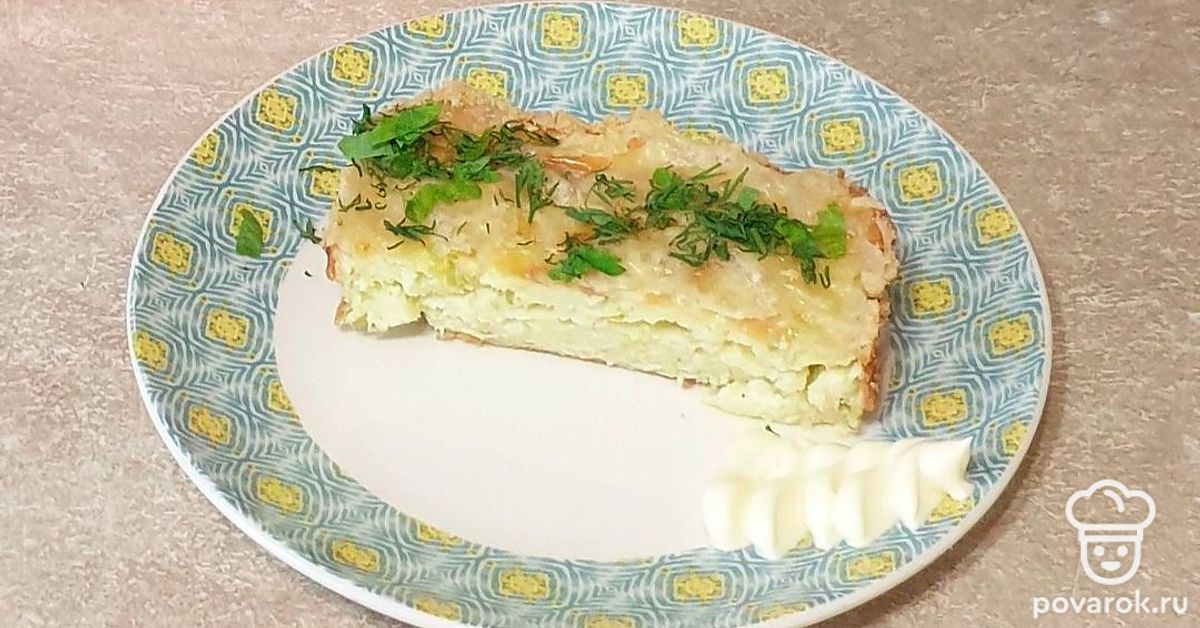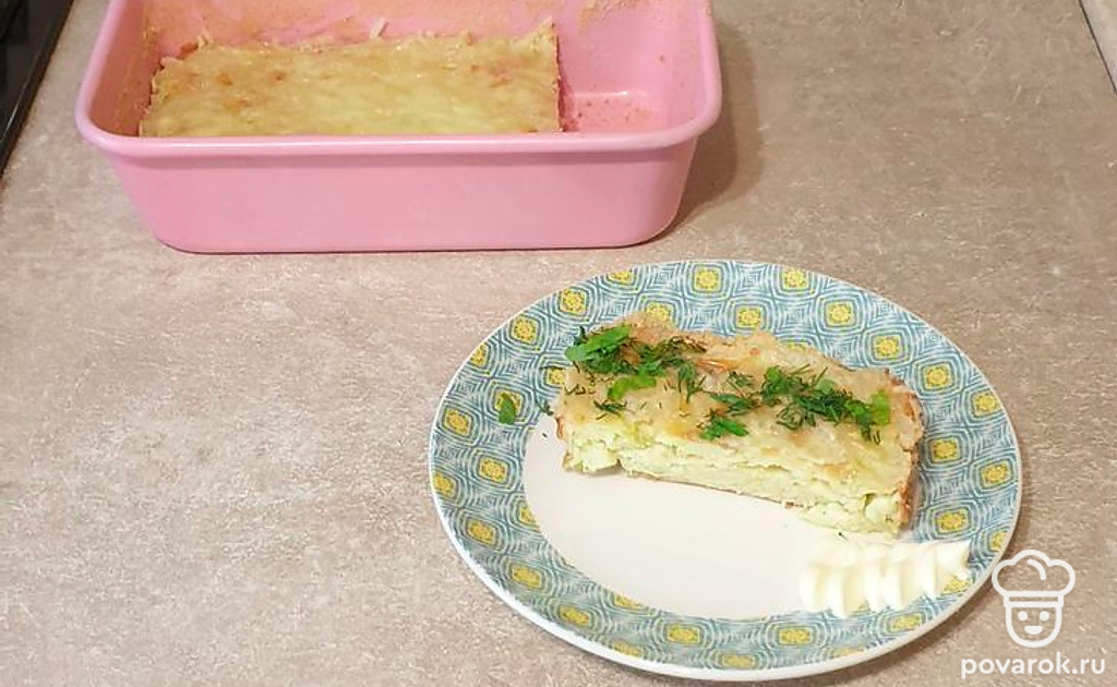 Запеканке дайте остыть около 10 минут. Подавайте, заранее нарезав на кусочки. Сверху можно посыпать свежей зеленью и дополнить сметаной. Приятного аппетита!