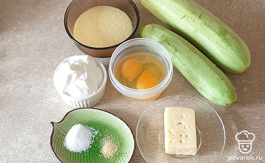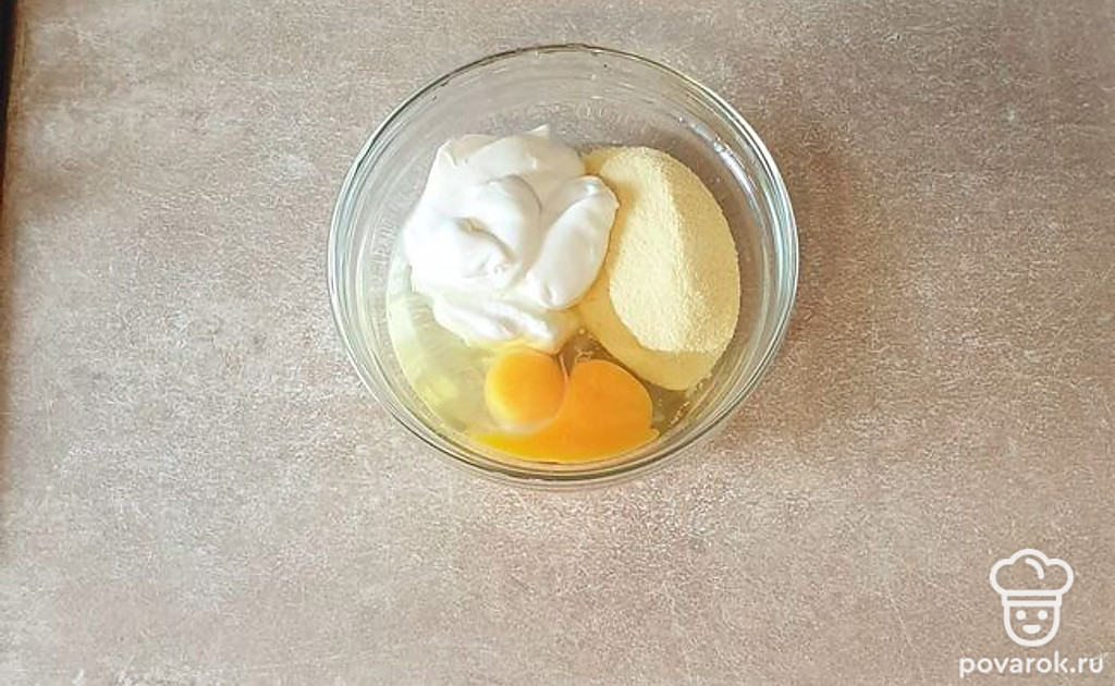 В миске смешайте сметану, яйца, половину чайной ложки соли и манную крупу. Оставьте на 10-15 минут. Манка должна слегка набухнуть.