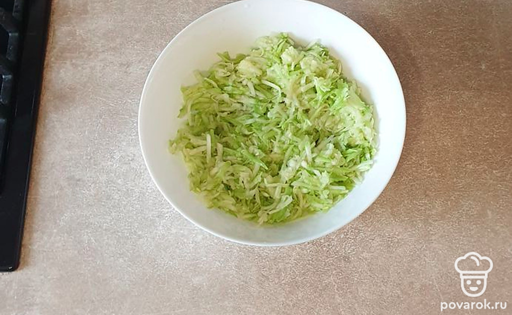 Кабачок помойте и натрите на крупной терке. Оставшуюся половину соли перемешайте и отставьте минут на десять. Нужно, чтобы кабачок пустил сок.