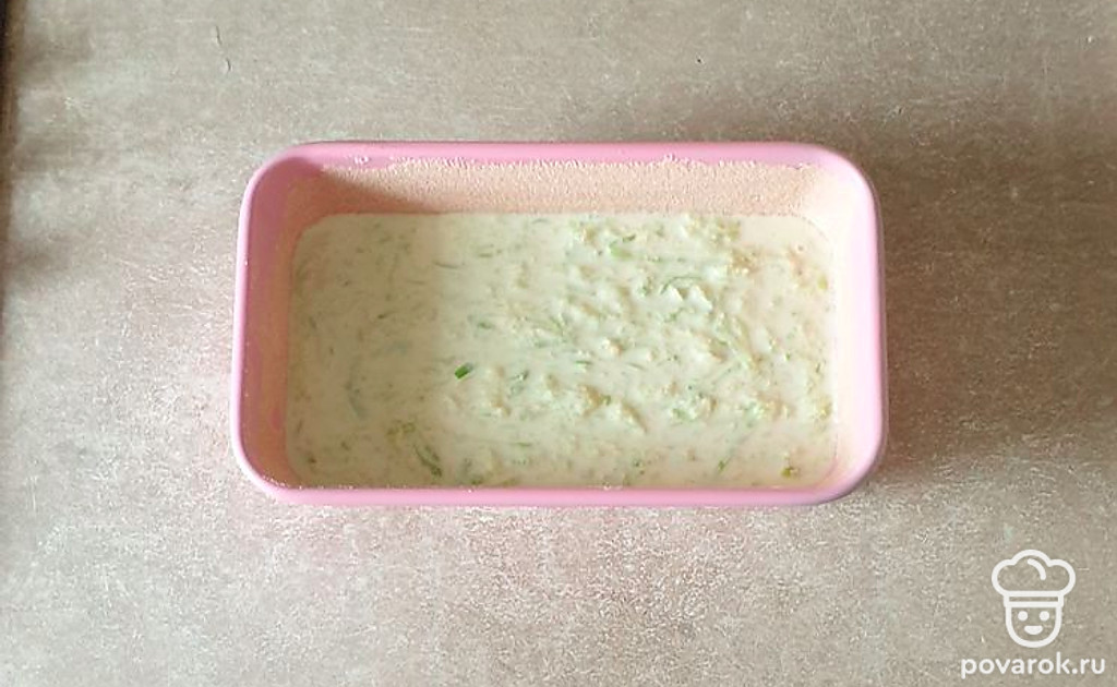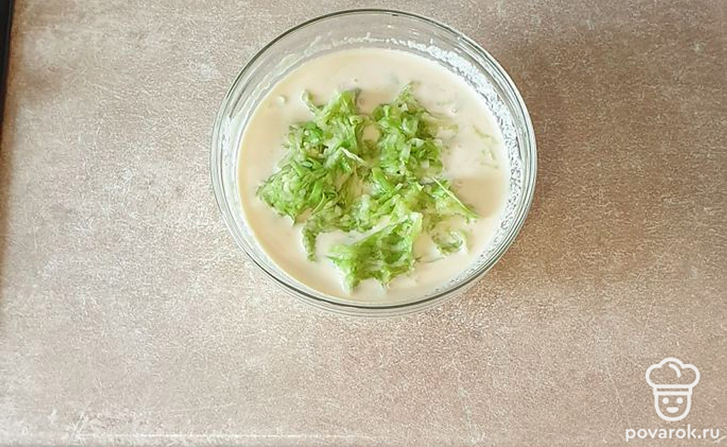 В сметанную смесь выложите сухой чеснок. Затем хорошо отожмите натертый кабачок и добавьте в сметанную заливку. Все перемешайте.