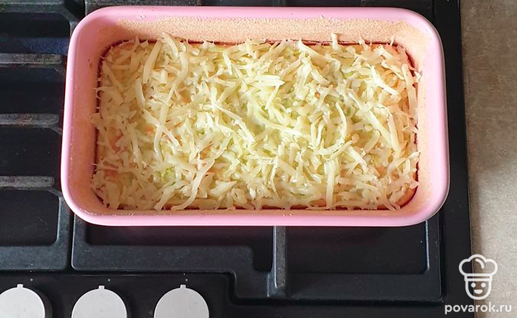 Форму достаньте и сверху посыпьте заранее натертым сыром. Выпекайте еще 10 минут.