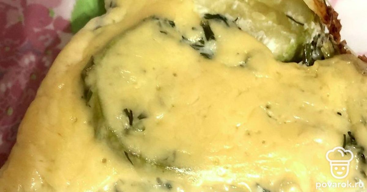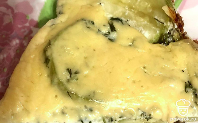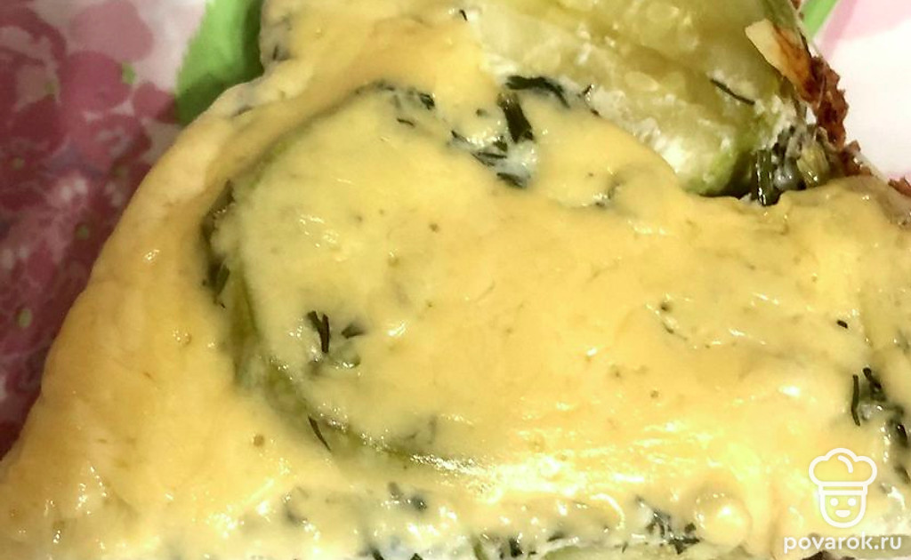 Залить кабачки смесью яйца и сметаны, сверху посыпать тертым сыром. Закрыть крышку мультиварки и выпекать при режиме «выпечка» 40 минут.