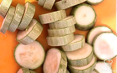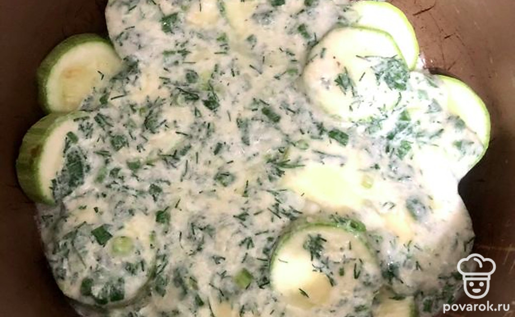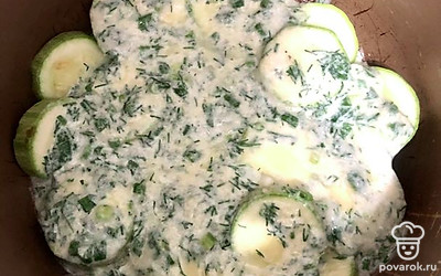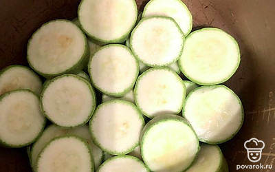 Форму мультиварки смазать растительным маслом и выложить кабачки. Каждый слой посолить.