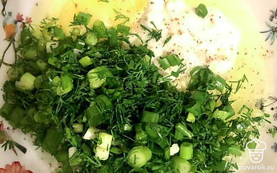 В посуду разбить 3 яйца, посолить, поперчить. Добавить зубчик чеснока, пропустив его через пресс, и хорошо взбить вилкой. Далее положить мелко нарубленную зелень — у меня укроп и лук — и 3 столовые ложки сметаны. Еще раз все хорошо перемешать.