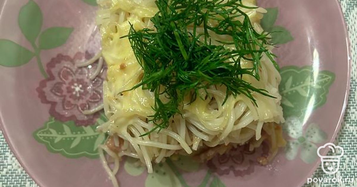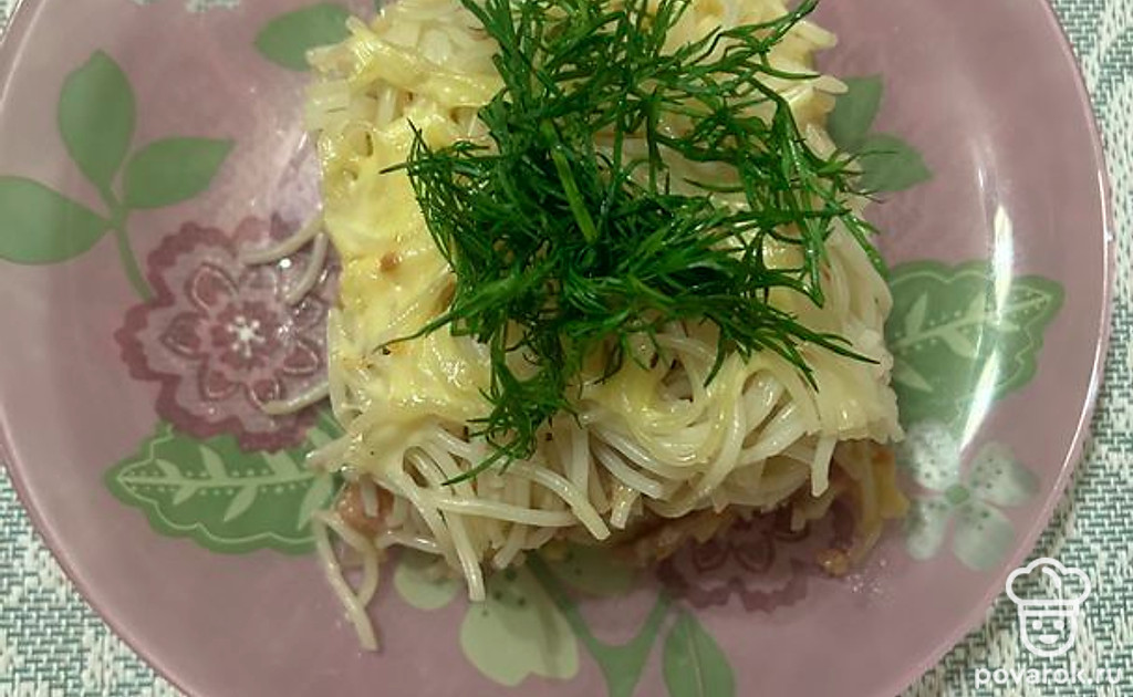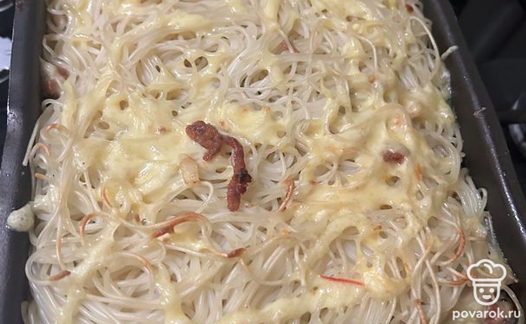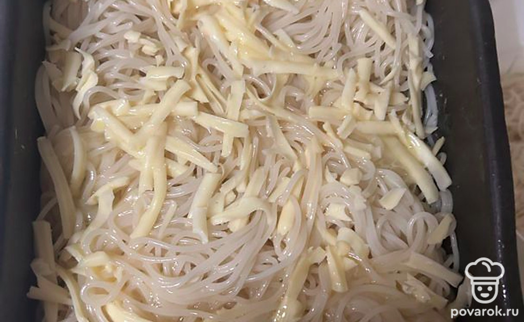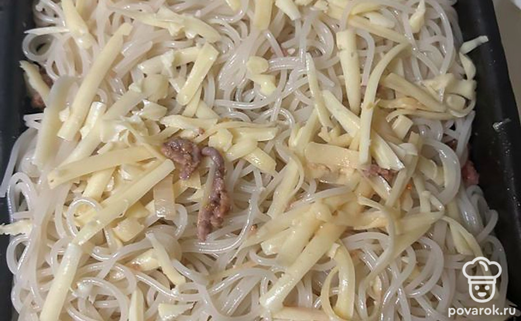 Завершающий слой — спагетти. Обильно посыпаем сыром, измельченным на крупной терке. Также сверху слои заливаем консистенцией из взбитого яйца.