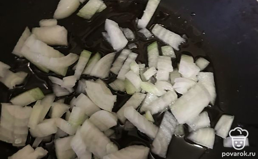 Крошим лук и обжариваем до золотистого цвета на подсолнечном масле.