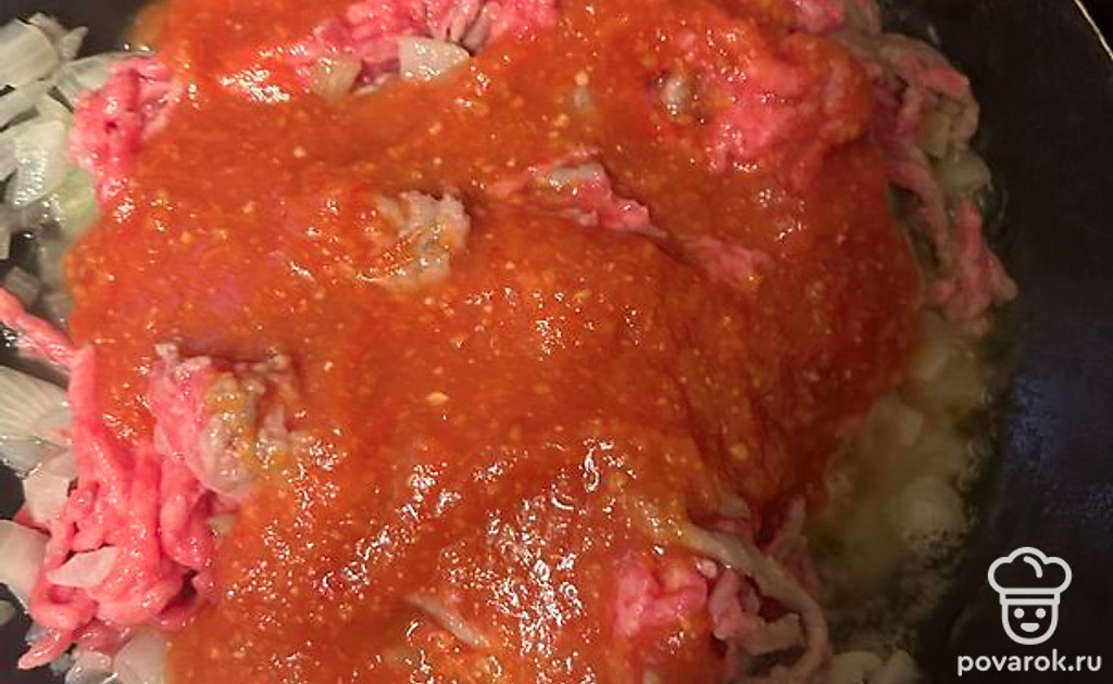 Заправляем томатной пастой. Смешиваем ингредиенты в сковородке и даем потомиться минут 10.