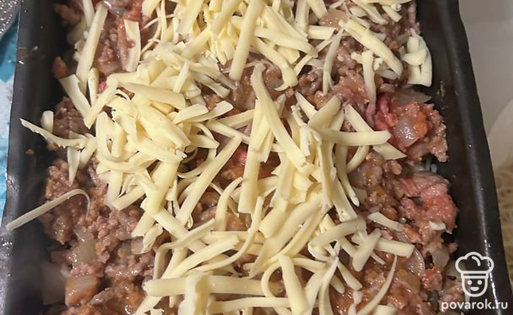 Следующим слоем выкладываем заготовку из фарша, также обильно посыпаем тертым сыром.