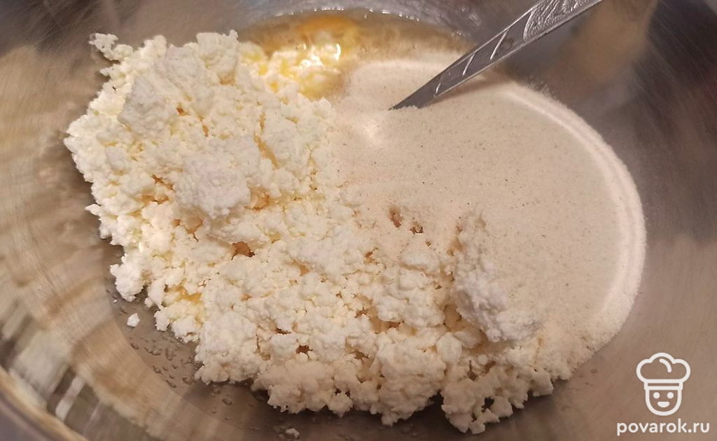 Затем добавляем манную крупу и творог.