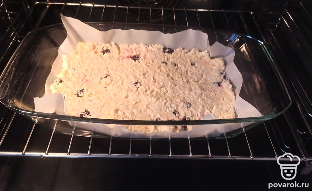 Тесто выкладываем в форму для выпечки и ставим в разогретую до 180 градусов духовку на 30 минут.