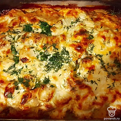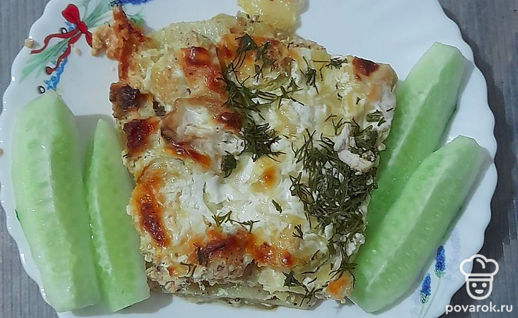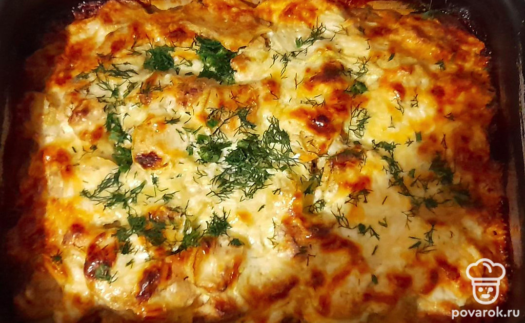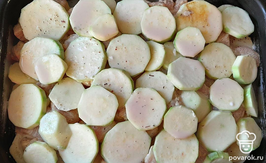 Вторым слоем выложить мясо, третий слой — кабачки. Немного разбавить сметану водой, добавить специи и залить кабачки. Накрыть фольгой и запекать при 180 градусах 40 минут. За 10 минут до окончания убрать фольгу и натереть равномерно сыр. Запекать, пока не подрумянится сыр.