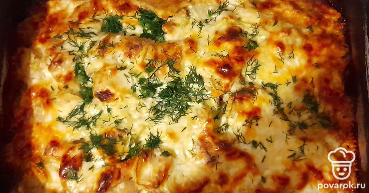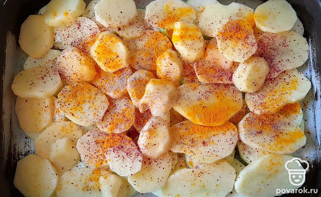 В форму для запекания выложить первым слоем картофель, посыпать специями (черный перец, сумах, куркума, соль).